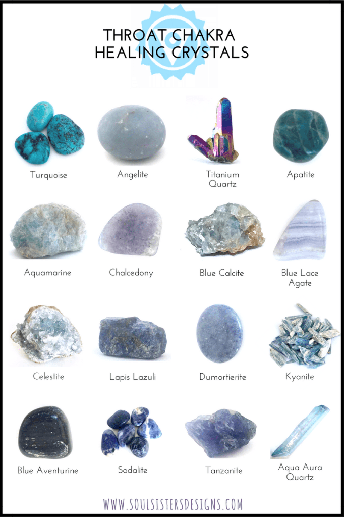 · Crystal Healing. Crystals vibrate with different energies. Helpful crystals for throat chakra healing work are crystals that are blue in color. These include: Sodalite, Lapis Lazuli, Aquamarine, blue celestite, turquoise, Blue lace agate, Blue Quartz, Kyanite, Labradorite, and Chrysocolla. Carrying these close to you and placing the gemstones on the area of your throat chakra while lying down can be very beneficial to helping with alignment.